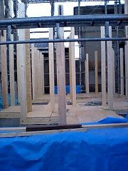 明日の上棟工事に備え、今日は1階床下地合板と短い柱の建て方まで、工事を進めました。