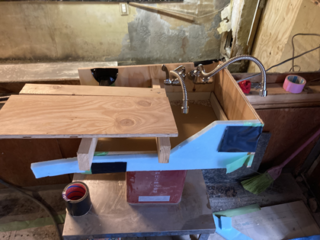 ↑舟形シンクのモックアッで、まな板の高さ・水栓位置などを検討中